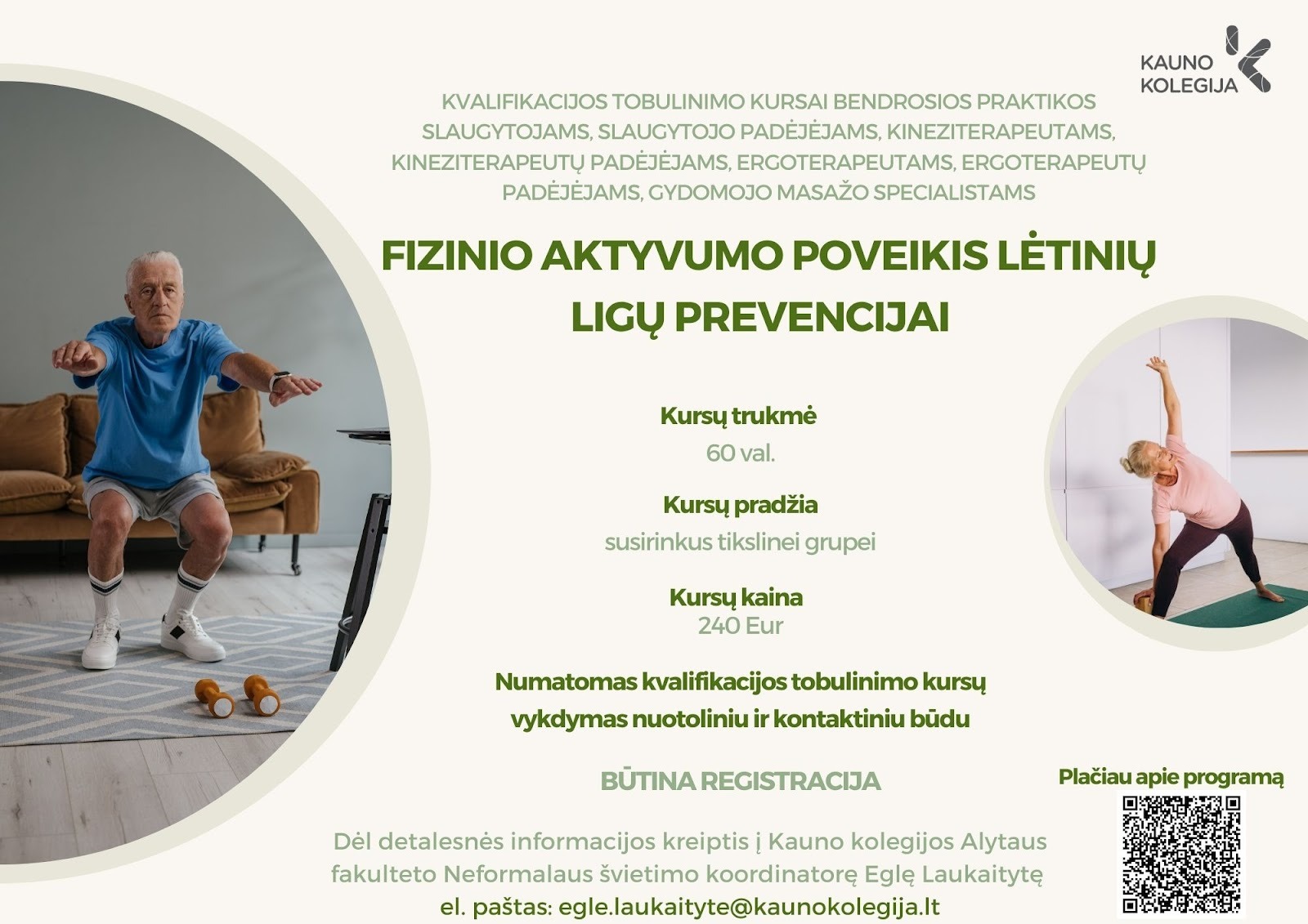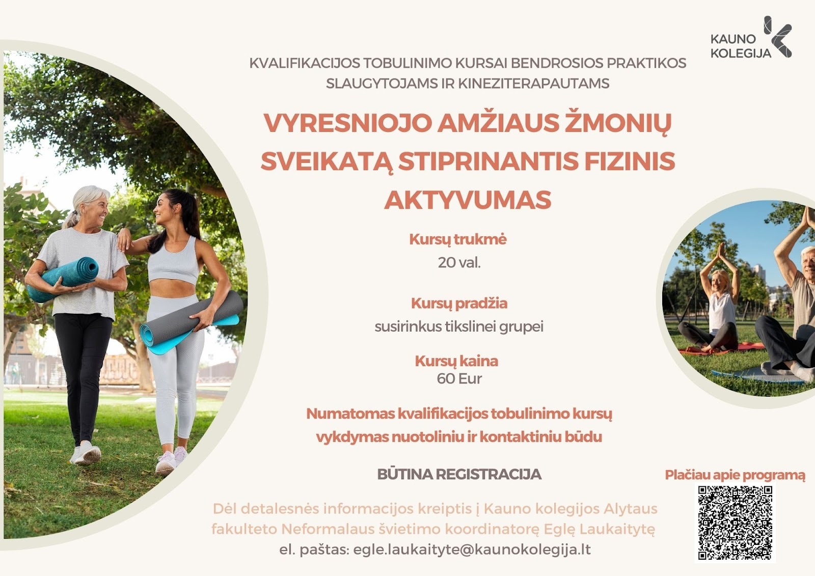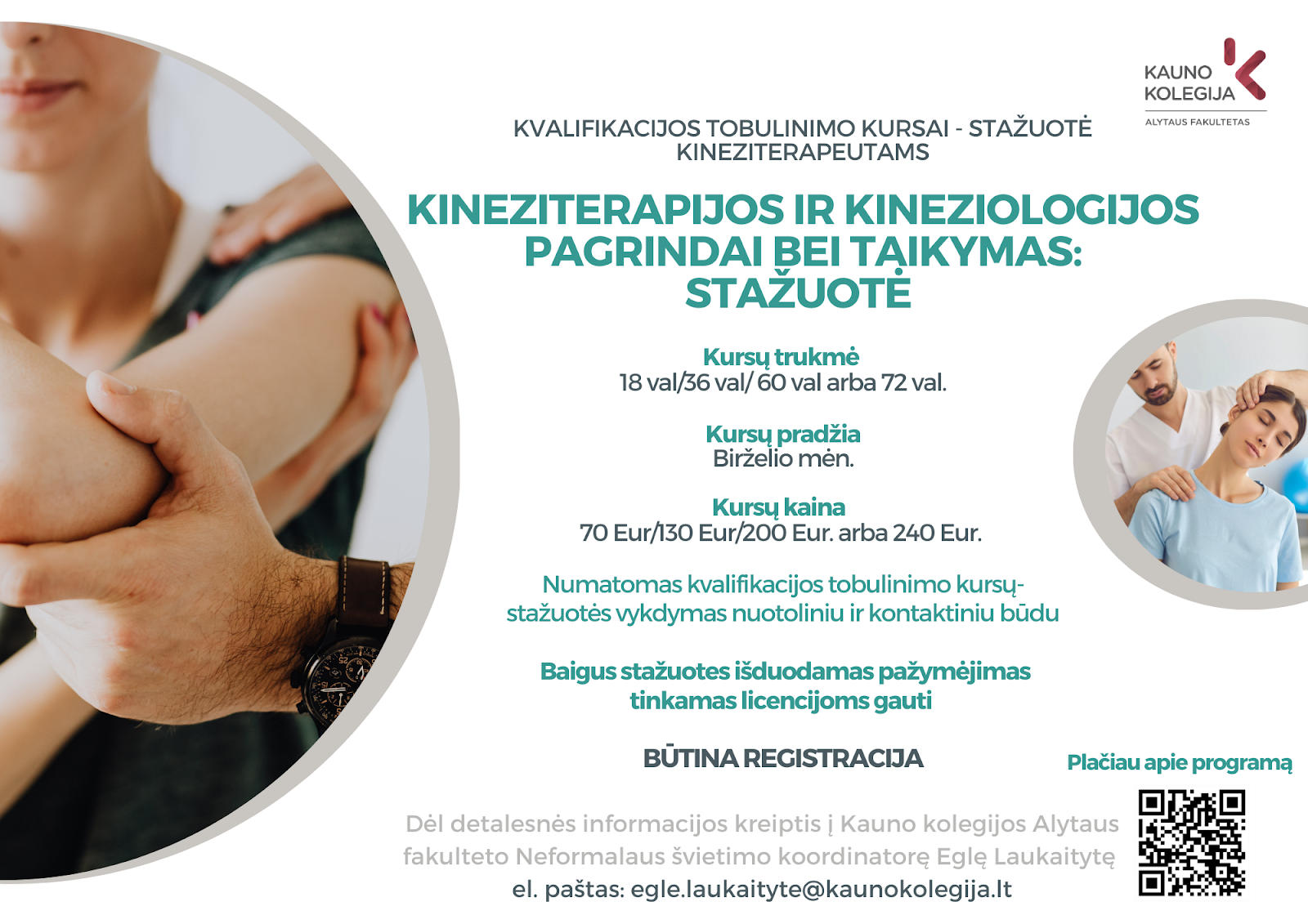 Kauno kolegijos Alytaus fakultetas kviečia asmens sveikatos priežiūros specialistus – kineziterapeutus – dalyvauti stažuotėse (18 val., 36 val., 60 val. arba 72 val. apimties), skirtose licencijai gauti ar atnaujinti.