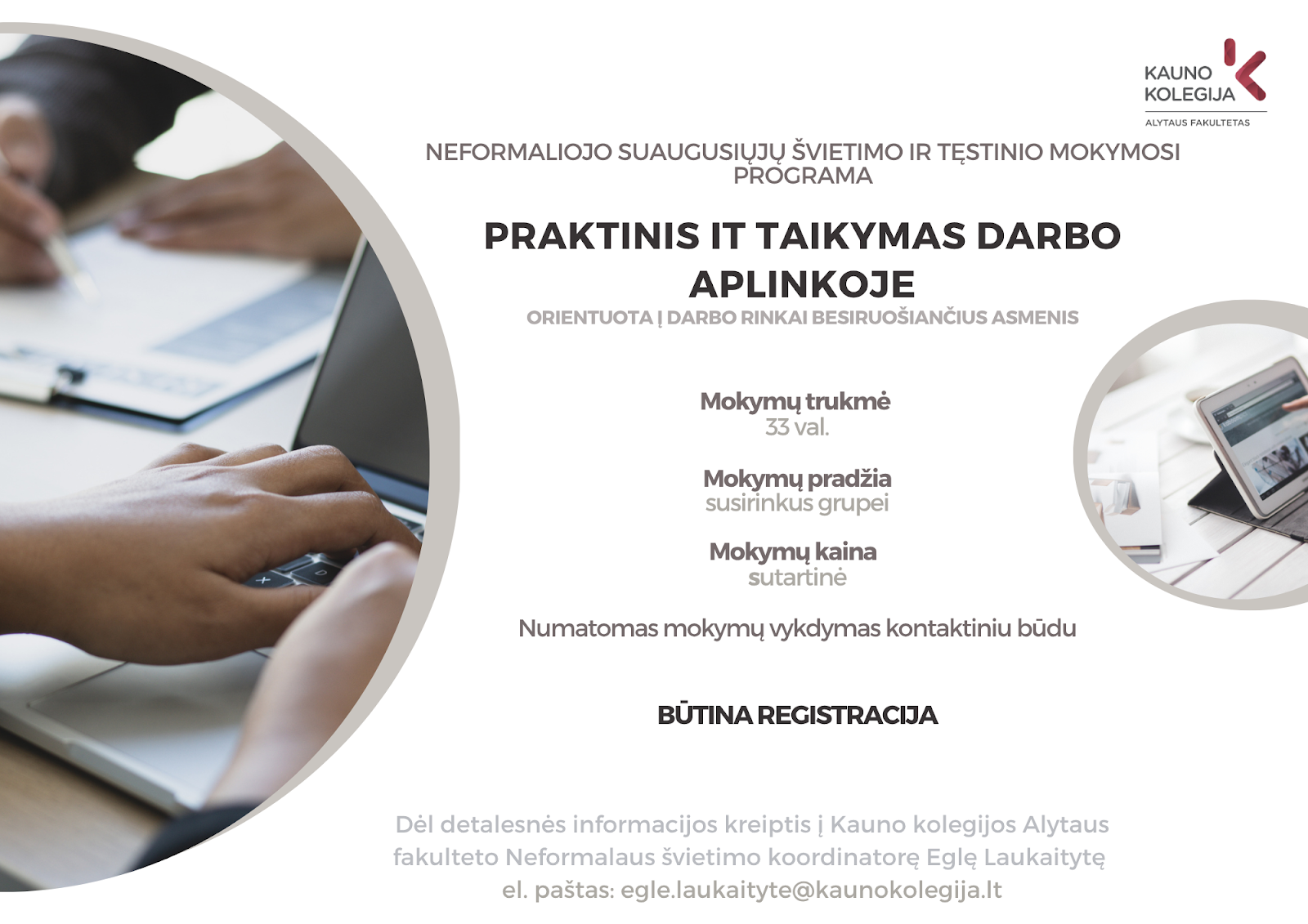 Mokymų vieta: Kauno kolegija Alytaus fakultetas, Studentų g. 17, Alytus.