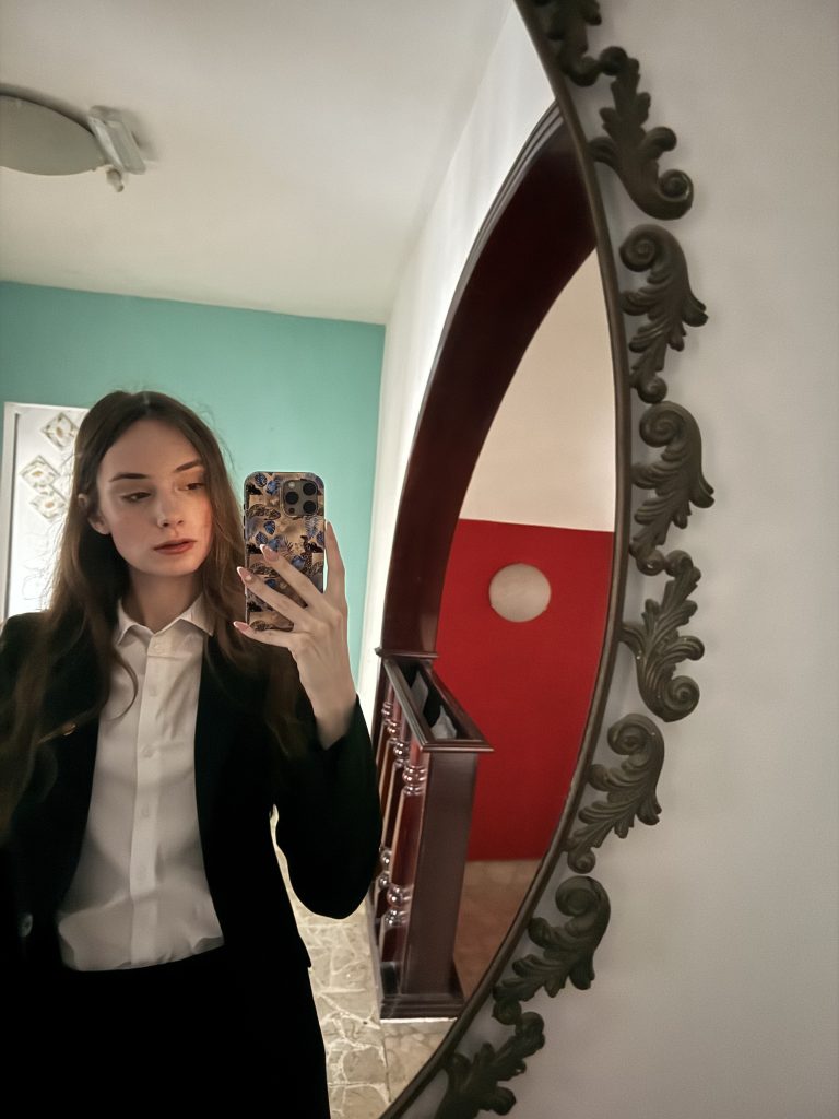 „Praktika yra labai įdomi, kiekviena diena vis kitokia – kartais skambinu klientams tikrindama nekilnojamojo turto objektus, taip pat pildau internetinę svetainę, dirbu su socialiniais tinklais. Džiugu paminėti, kad su kolegomis ne tik dirbame, bet ir pasikalbame, draugiškai pasijuokiame vieni iš kitų, dažnai susėdame prie pasitarimų stalo ir vaišiname vieni kitus skanėstais. O aš juos mokau lietuviškų žodžių.“