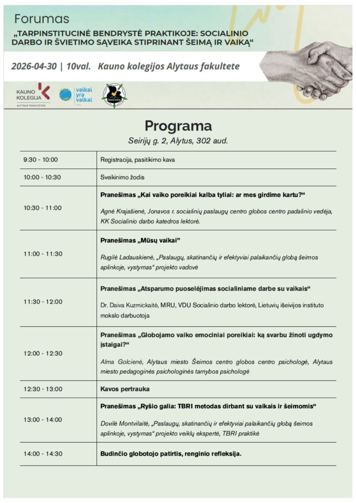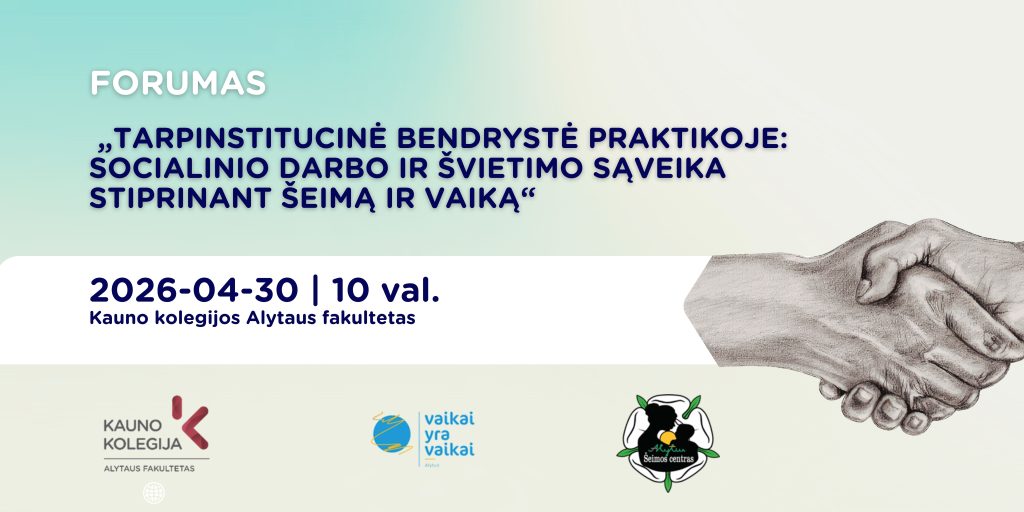 Kauno kolegijos Alytaus fakultetas kartu su Alytaus miesto šeimos centro Globos centru kviečia socialinės srities ir švietimo specialistus į forumą „Tarpinstitucinė bendrystė praktikoje: socialinio darbo ir švietimo sąveika stiprinant šeimą ir vaiką“.
