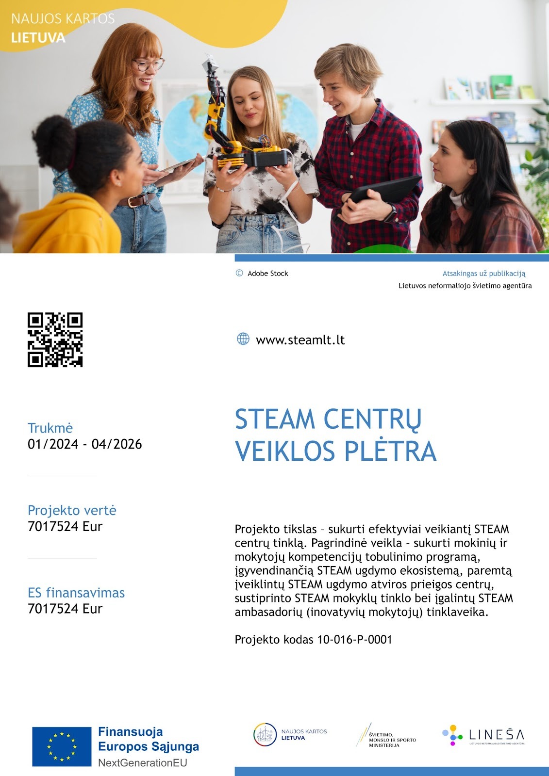 Lietuvos neformaliojo švietimo agentūra (toliau – LINEŠA) kartu su partneriais Vilniaus universitetu, Klaipėdos universitetu, VšĮ Mokslo ir inovacijų sklaidos centru, Panevėžio švietimo centru, Alytaus kolegija, Marijampolės kolegija, Telšių švietimo centru, Tauragės pagalbos mokytojui ir mokiniui centru bei Utenos švietimo centru įgyvendina projektą „STEAM centrų veiklos plėtra”, projekto kodas 10-016-P-0001. Projektas finansuojamas Ekonomikos gaivinimo ir atsparumo didinimo priemonės (EGADP) lėšomis.