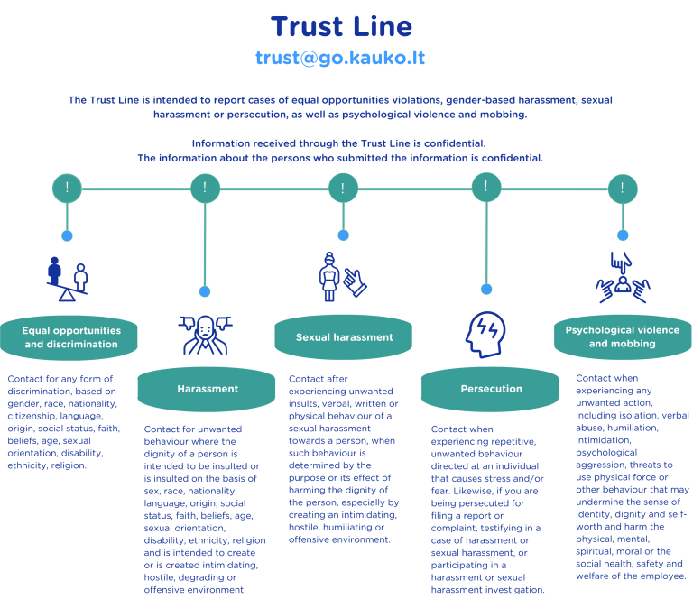 An established committee investigates reports and/or appeals of violations of equal opportunities, harassment, sexual harassment, persecution, psychological violence, and mobbing. E-mails and/or appeals can be sent to trust@go.kauko.lt.