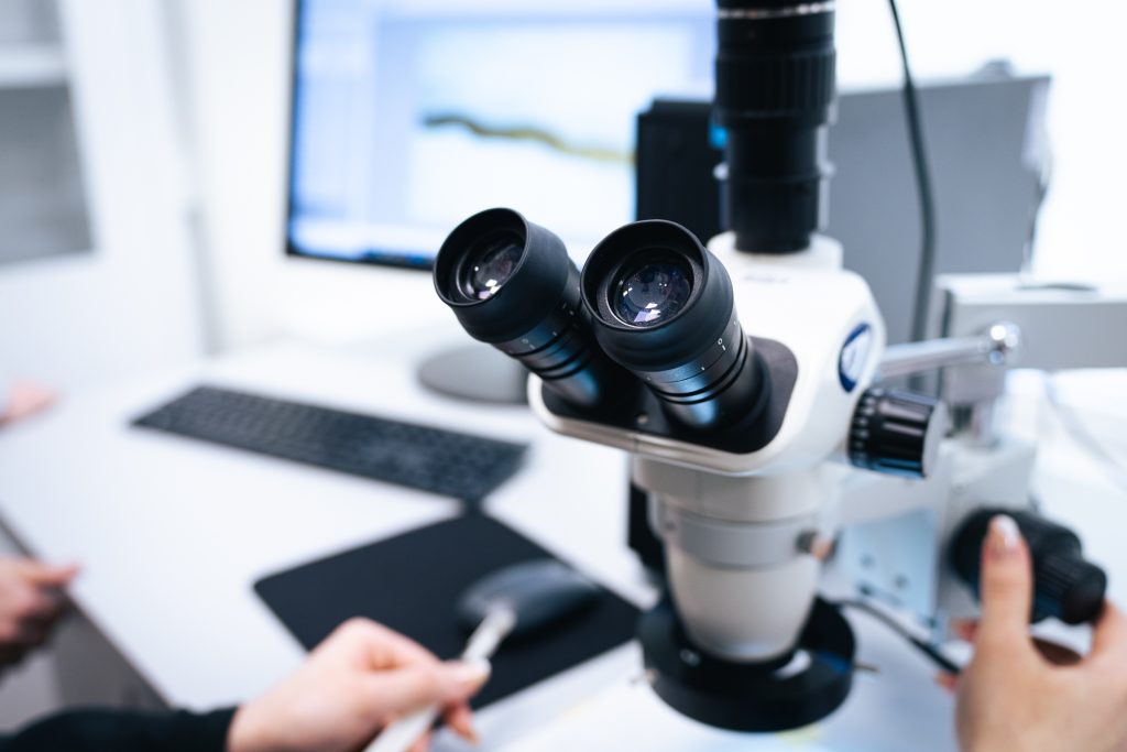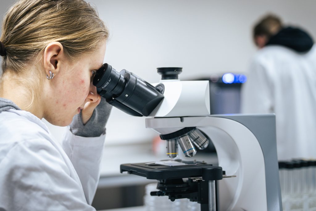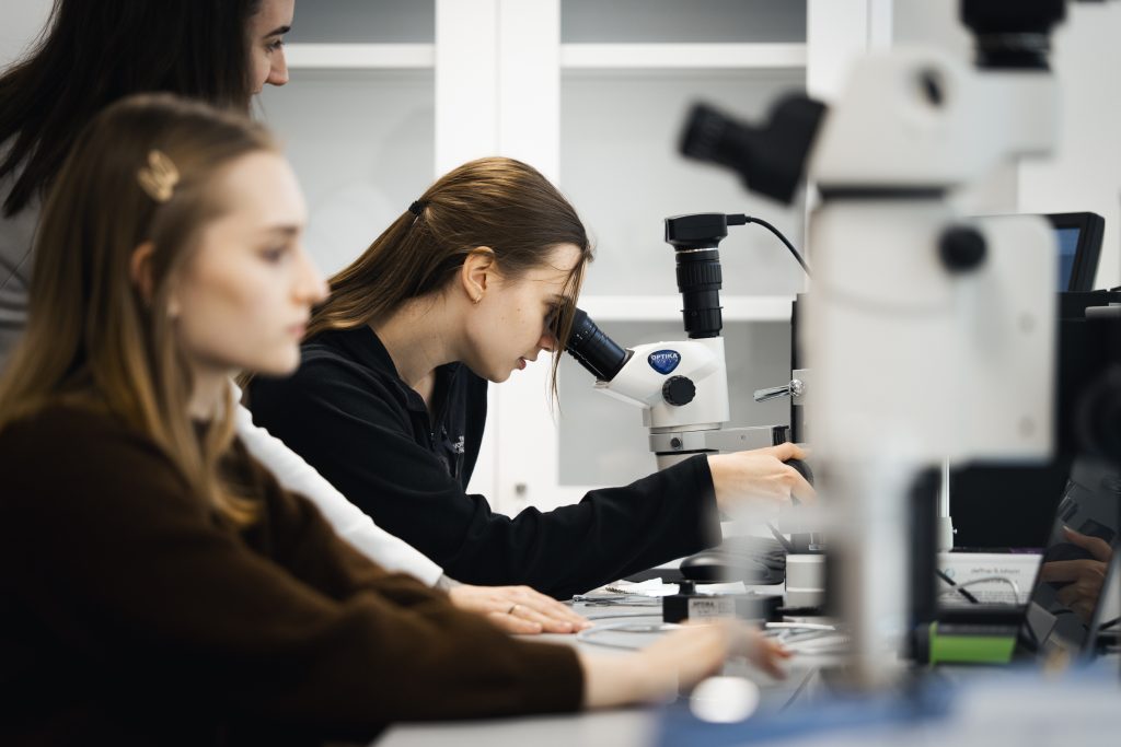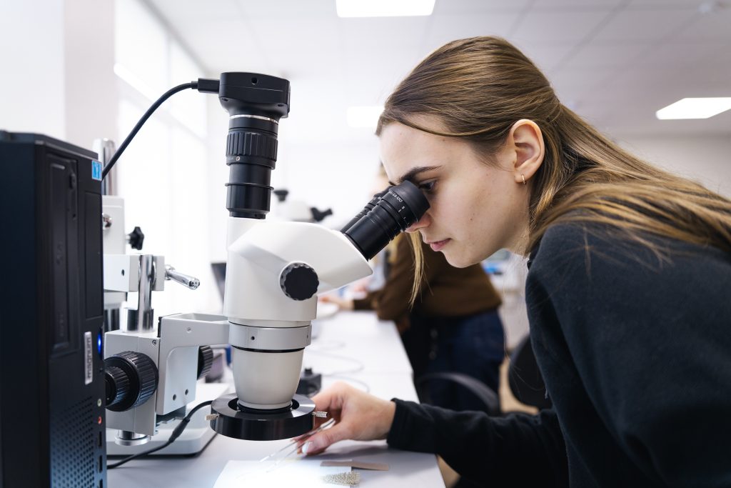 Researcher and student using a microscope in a modern laboratory at Kauno kolegija, analysing material samples on a computer screen.