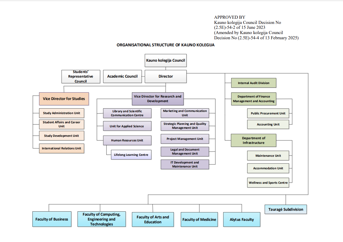 The activities of Kauno kolegija Higher Education Institution are regulated by the Government of the Republic of Lithuania, the Ministry of Education, Science and Sport, in accordance with the procedures established by applicable legislation. The governing bodies of the institution are constituted, and their responsibilities defined, in line with the Civil Code of the Republic of Lithuania and the Law of Science and Studies. The Kauno kolegija Higher Education Institution has a collegial governance structure, consisting of the Council and the Academic Board, alongside a sole executive body – the Director.