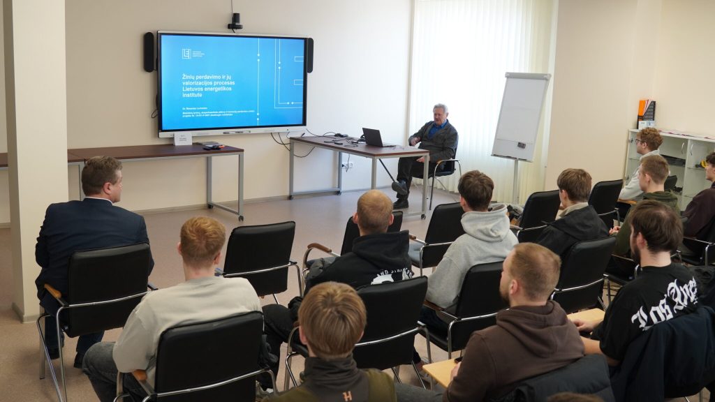 Vizito pradžioje MTEPIPC projektų vadovas Rimantas Levinskas studentus supažindino su vykdomo projekto „Inovacijų ir technologijų perdavimo centrų kompetencijų stiprinimas“ poveiklės „Žinių perdavimo ir komercinimo sistemos stiprinimas Lietuvos energetikos institute“ tikslais ir Instituto sukurtais mokslinių tyrimų ir eksperimentinės plėtros (MTEP) produktais. Detaliau apie žinių valorizacijos procesą Rimantas Levinskas pristatė pranešime „Žinių perdavimo ir jų valorizacijos procesas Lietuvos energetikos institute“, kuriame, pateikiant konkrečius pavyzdžius, aptarė pagrindinius žinių valorizacijos aspektus: inovacijų skatinimą, sąsajas su verslu, ekonominę vertę bei socialinį poveikį.