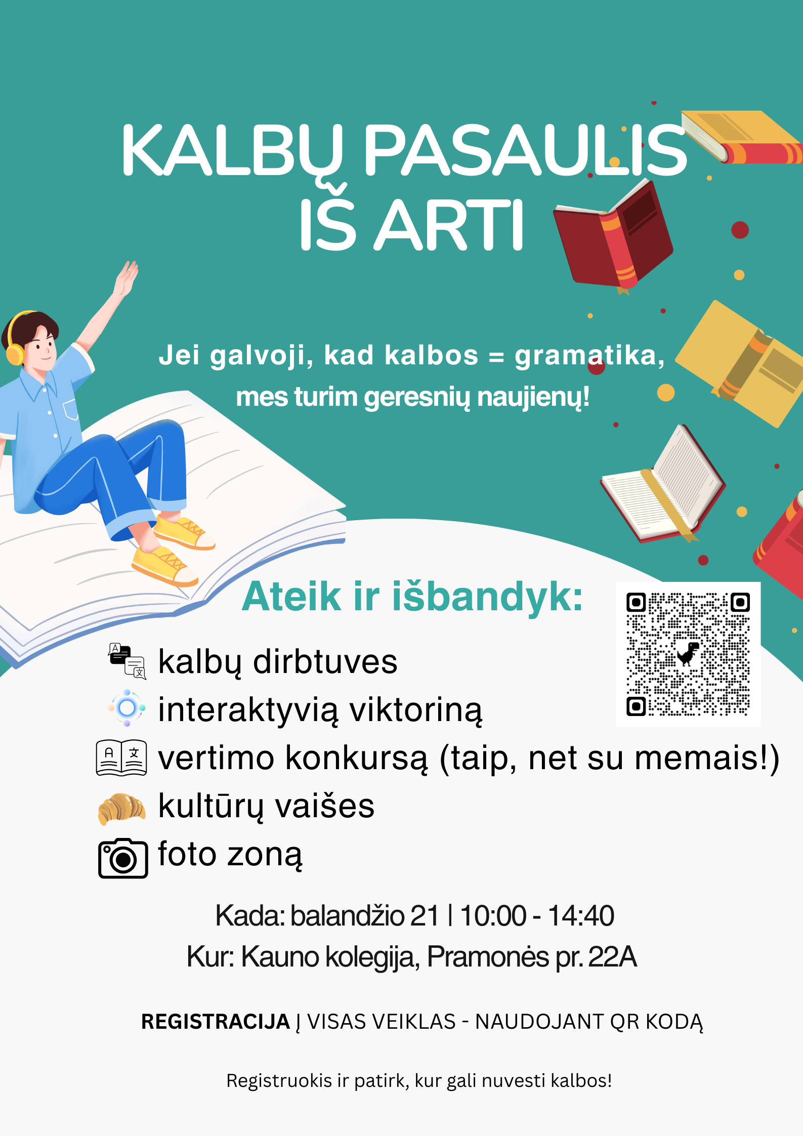 Kauno kolegijos Menų ir ugdymo fakulteto Kalbų centras kviečia I–IV gimnazijos klasių mokinius dalyvauti nemokamame renginyje „Kalbų pasaulis iš arti“, kuris vyks 2026 m. balandžio 21 d. 10.00–14.40 val. Kauno kolegijoje (Pramonės pr. 22A, Kaunas).