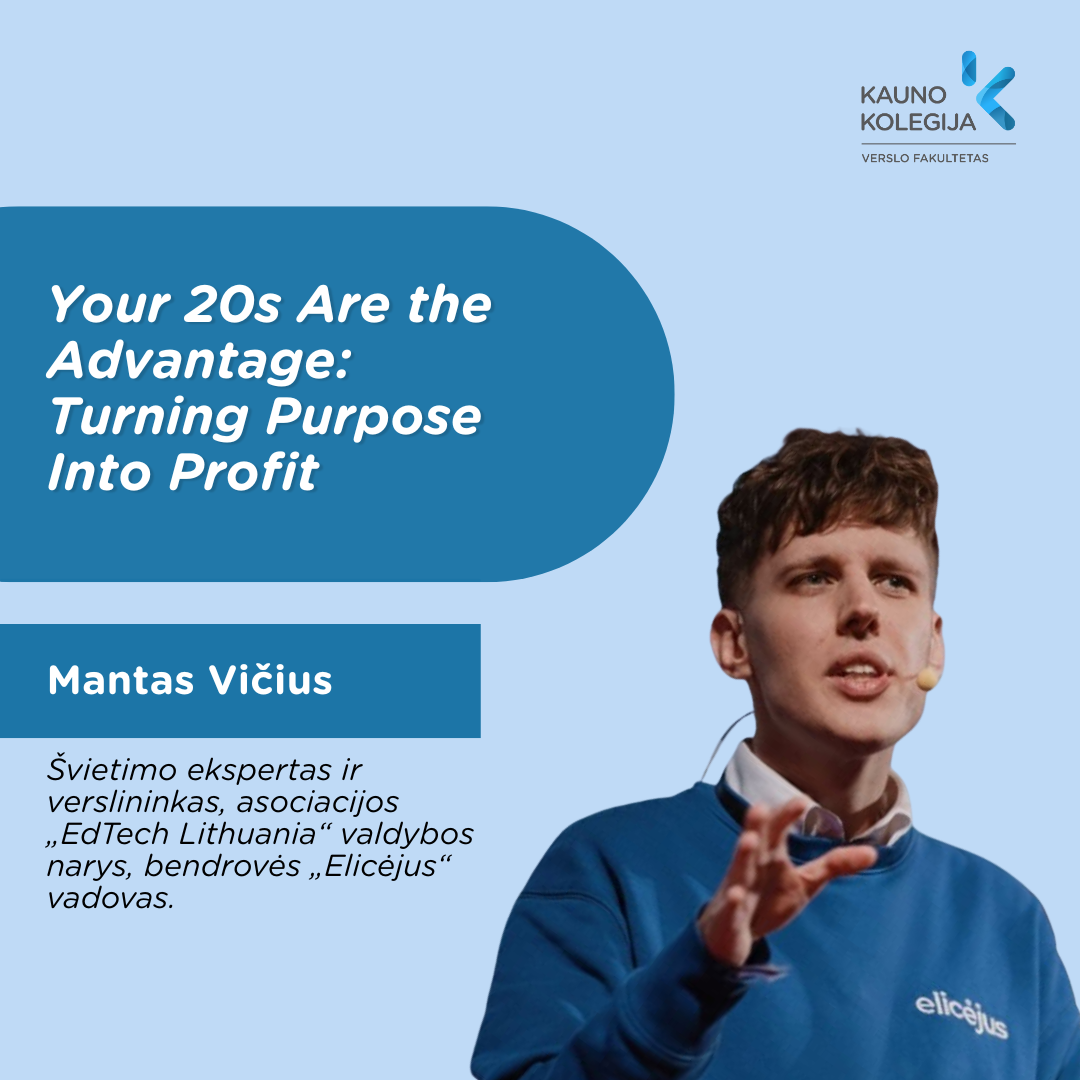 Verslumo temą tęs švietimo technologijų (EdTech) sektoriaus ekspertas, „Elicėjaus“ vadovas bei „EdTech Lithuania“ valdybos narys Mantas Vičius. Savo pranešime „Your 20s Are the Advantage: Turning Purpose Into Profit“ jis įkvėps studentus išnaudoti studijų metus kaip strateginį pranašumą, vystant tvarias verslo iniciatyvas. M. Vičius, remdamasis savo patirtimi, kuriant personalizuotus mokymosi įrankius, akcentuos, kad sėkmingam startui nebūtina turėti visų atsakymų – svarbiausia yra gebėjimas greitai mokytis ir dvejones paversti realiais veiksmais.