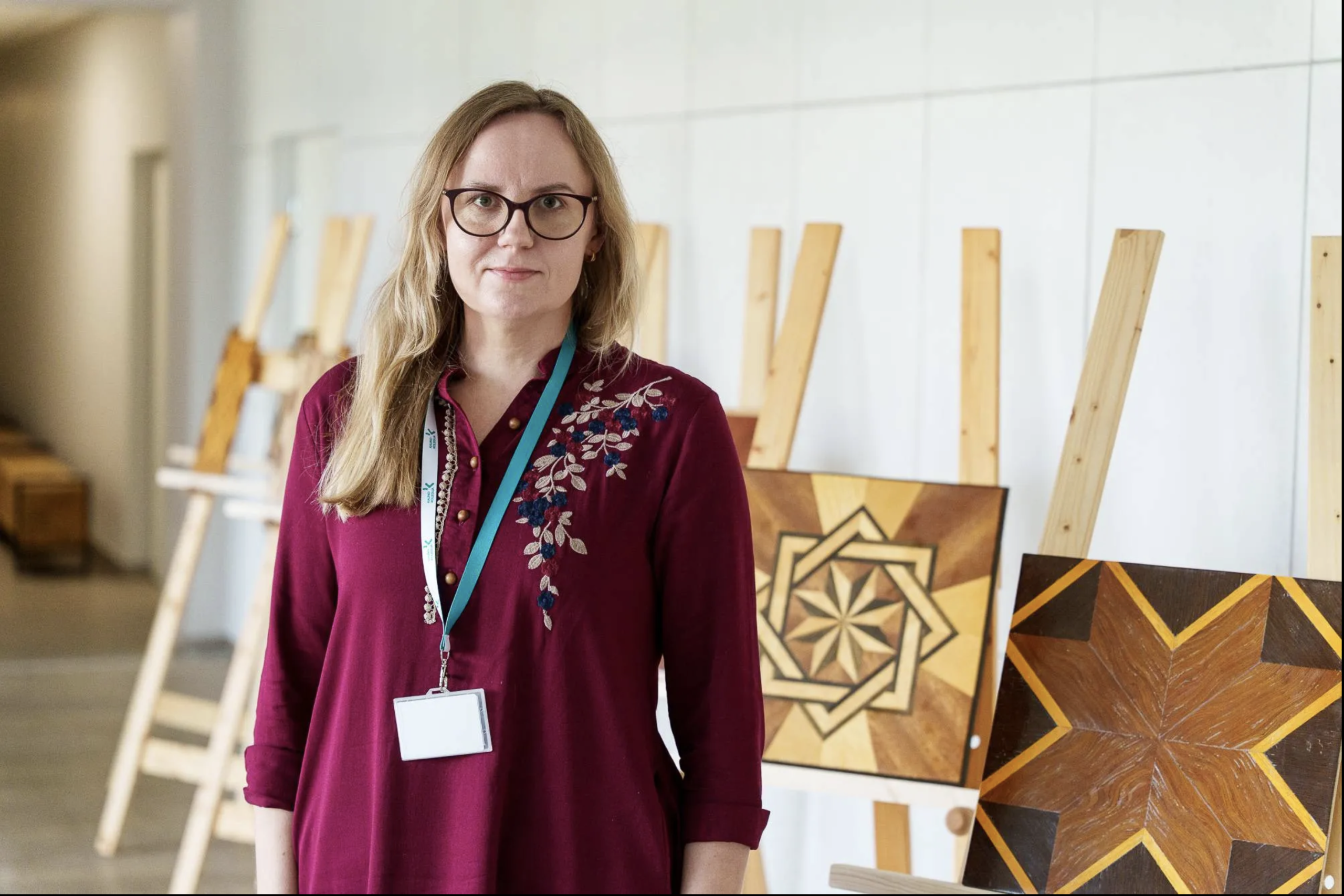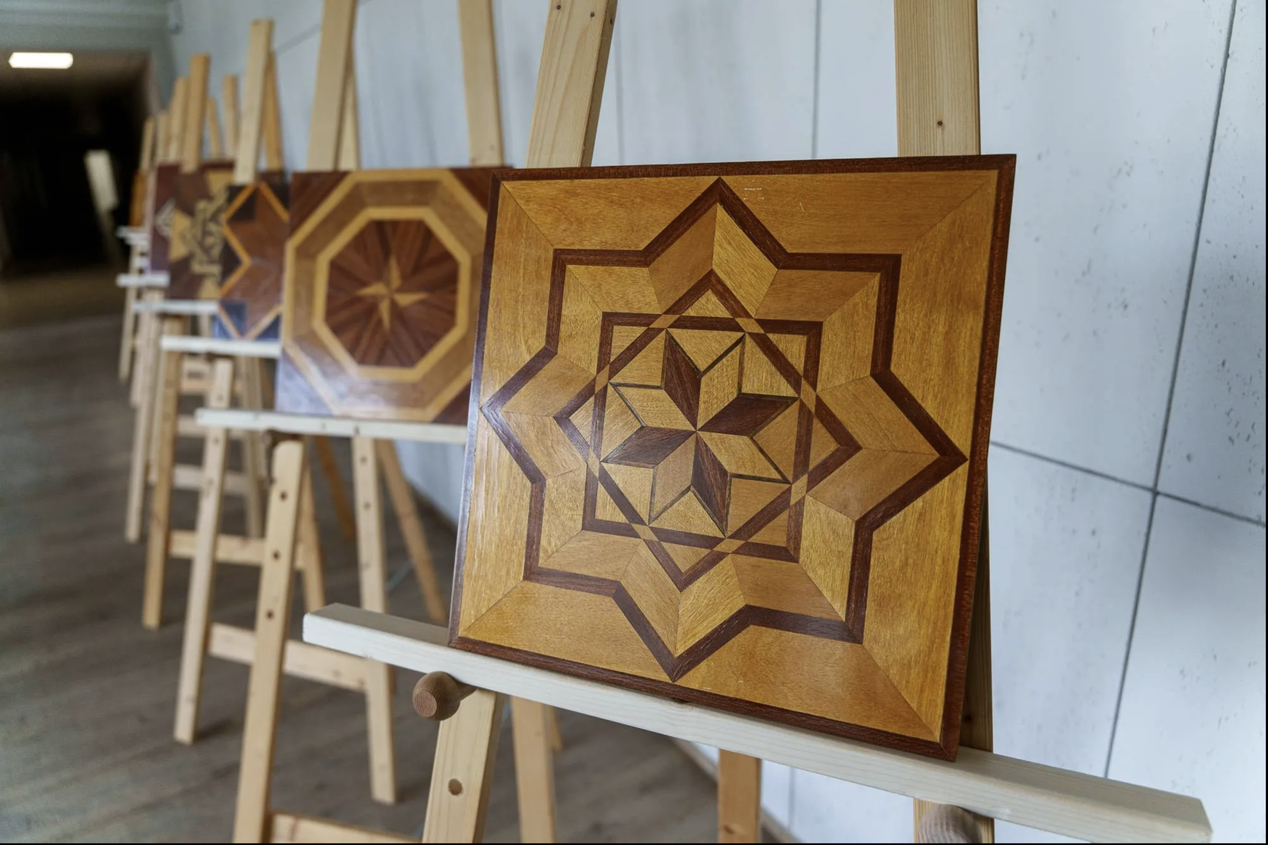 Pakeliui į baldų restauravimo dirbtuves dėstytojai kvietė žvilgtelti į Kauno kolegijos Objektų konservavimo ir restauravimo programos studentų darbų parodą „Medžio labirintai – daugialypė marketri technika“, kurioje eksponuojami medžio paveikslai. Juose dominuoja geometriniai raštai: kvadratai, trikampiai bei sudėtingesnės formos, taip pat lietuvių tautiniai simboliai – tulpės/lelijos, liaudies tekstilės geometrija.