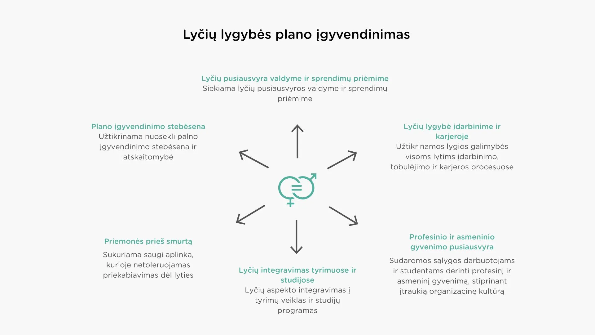 Tikslas – skatinti institucinius kultūrinius pokyčius lyčių lygybės srityje, įtvirtinant tvarią, duomenimis grįstą lygybės politiką, stiprinant lyčių aspektų integraciją į studijas ir mokslo ir meno taikomąją veiklą, mažinant struktūrinę nelygybę ir paslėptą šališkumą darbuotojų atrankose, karjeroje ir sprendimų priėmime, didinant nepakankamai atstovaujamų grupių matomumą, diegiant veiksmingas darbo ir asmeninio gyvenimo derinimo priemones, užtikrinant nulinės tolerancijos principo smurtui ir priekabiavimui įgyvendinimą bei užtikrinant nuoseklią Lyčių lygybės plano įgyvendinimo stebėseną ir atskaitomybę.