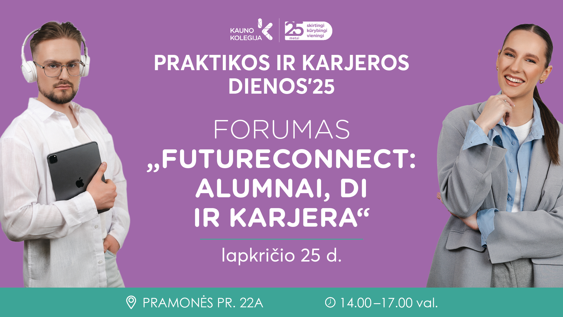 Kviečiame lapkričio 25 d. dalyvauti alumnų forume „FutureConnect: alumnai, DI ir karjera“. Renginys skirtas visai bendruomenei, o ypač studentams, norintiems sužinoti, kaip dirbtinis intelektas (DI) keičia karjeros kelią, studijas ir profesines galimybes. Forumas pradės renginių ciklą Praktikos ir karjeros dienos’25, kuris tris dienas kvies tyrinėti karjeros kryptis, susipažinti su darbdaviais ir atrasti naujas profesines galimybes.