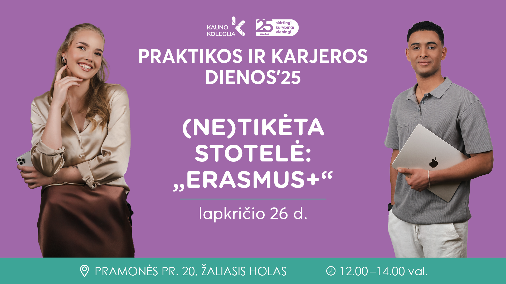 Lapkričio 26 d. nuo 12.00 iki 14.00 val. Žaliajame hole (Pramonės pr. 20) vyks kontaktų mugė, kur fakultetų stenduose dalyvaus tarptautinės veiklos koordinatoriai ir „Erasmus+“ programoje jau dalyvavę studentai. Čia galėsi sužinoti, kaip atrodo pirmieji žingsniai „Erasmus+“ kelyje, išgirsti tikras sėkmės istorijas ir pasisemti įkvėpimo savo būsimam išvykimui.