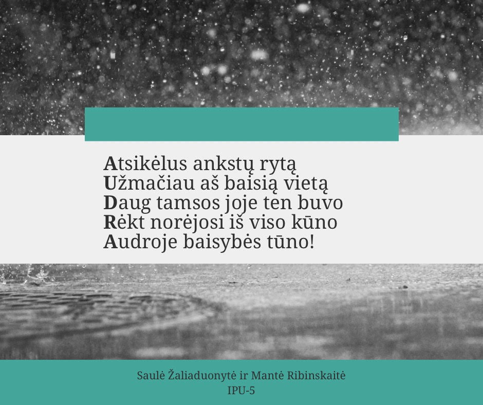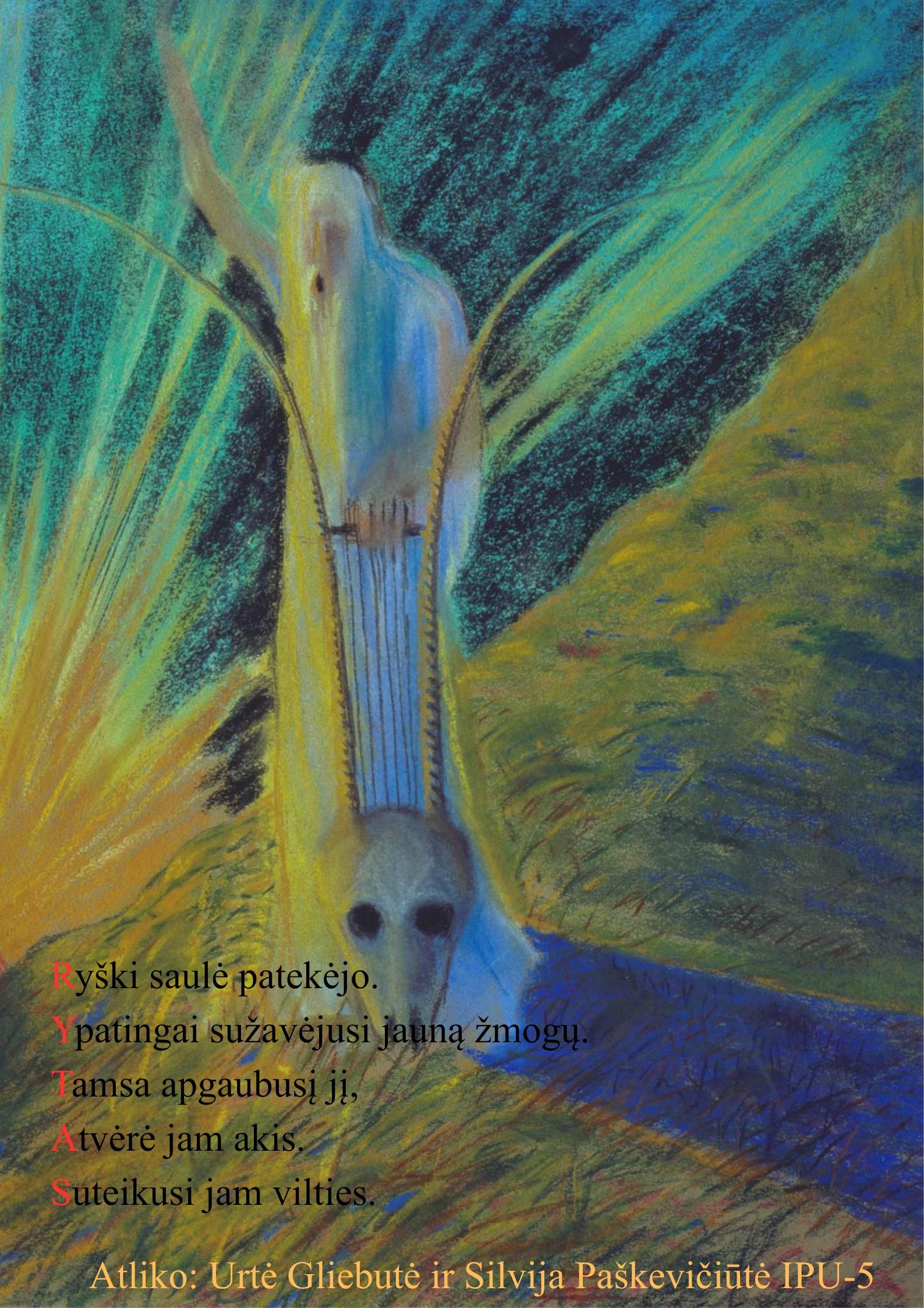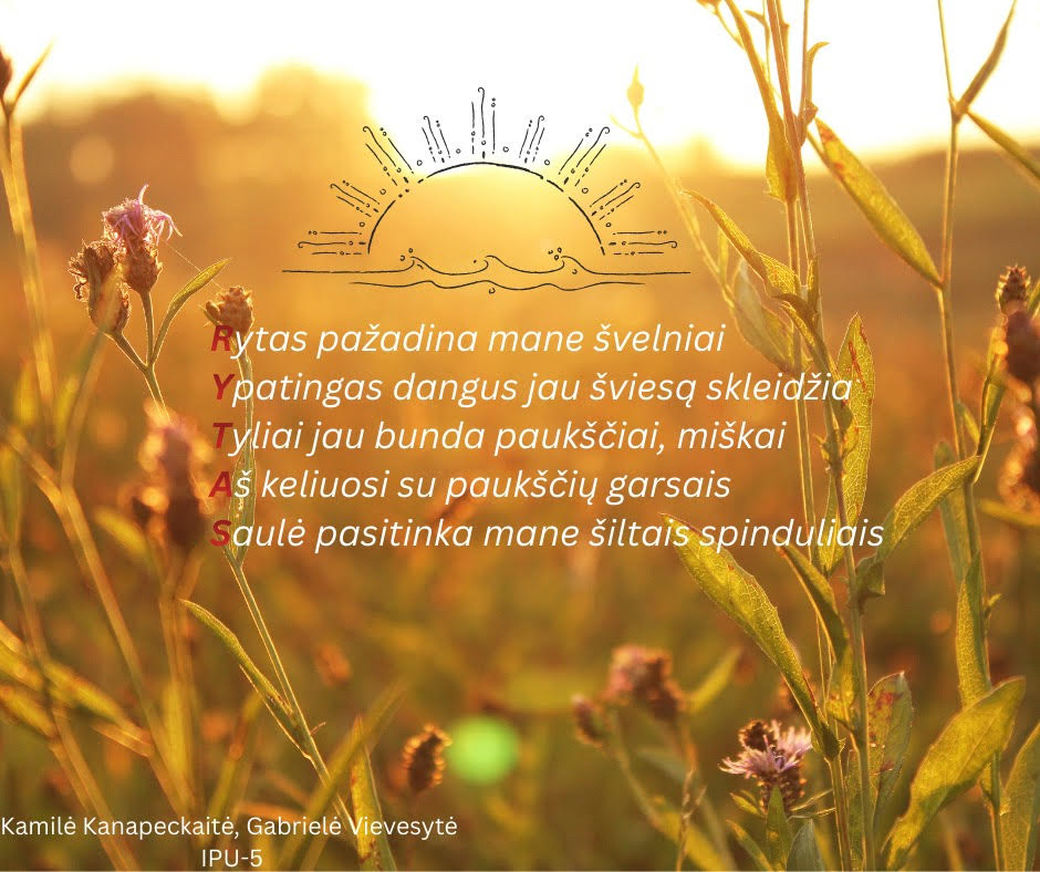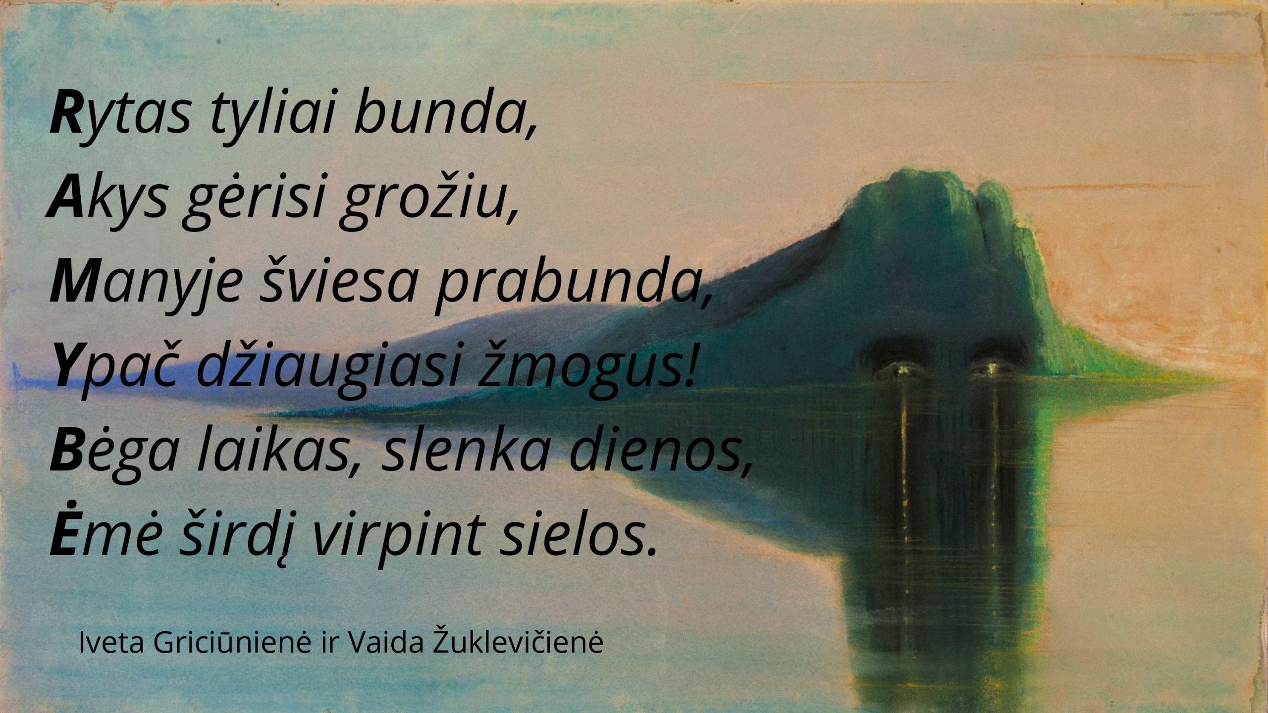 Minint Mikalojaus Konstantino Čiurlionio 150-ąsias gimimo metines, studentams buvo pasiūlyta pasirinkti dailininko paveikslą ir pagal jį sukurti akrostichą. Tokia kūrybinė užduotis, perkeliama į ikimokyklinį kontekstą, skatina vaikų žodinės kalbos supratimą, aktyvų dalyvavimą grupinėse veiklose ir socialinę sąveiką. Vaikų žaidimai – tiek kasdienio gyvenimo, tiek fantazijos pasaulio siužetų – padeda ugdyti gebėjimą susieti išgirstą žodį su daiktu, reiškiniu ar veiksmu, taip plėtojant kalbos prasmių suvokimą.
