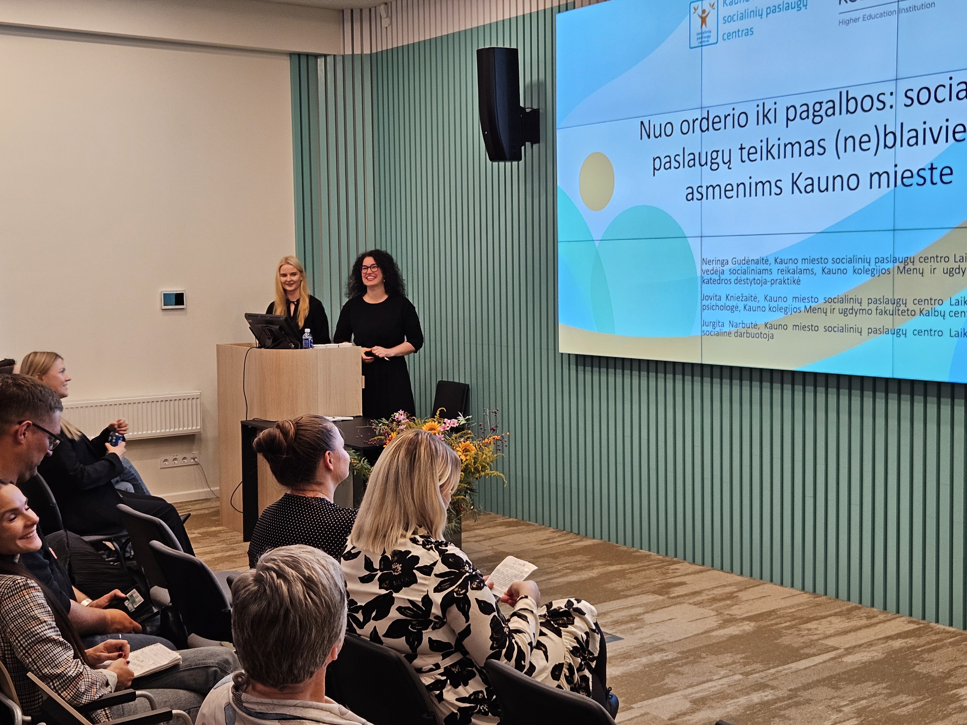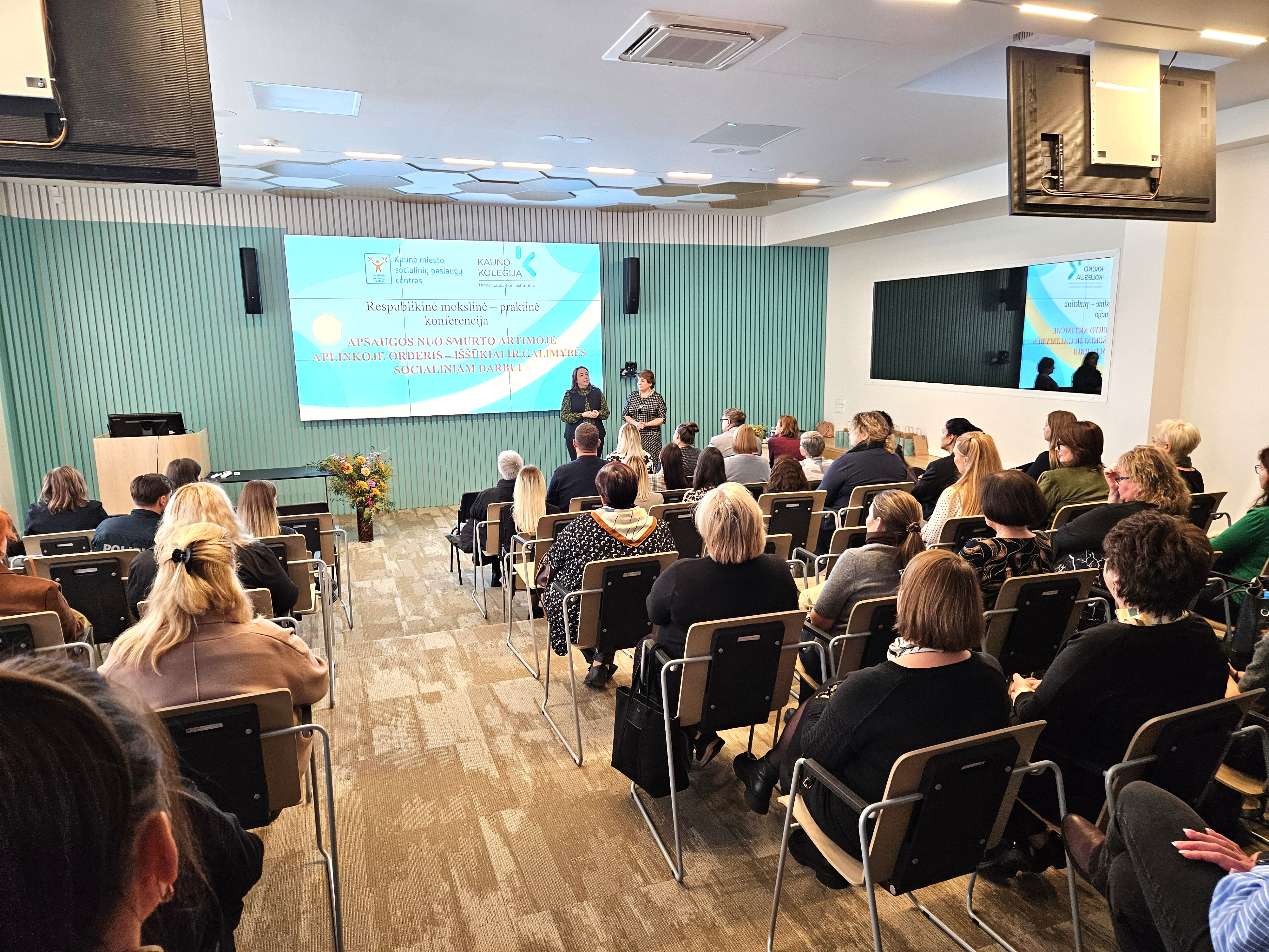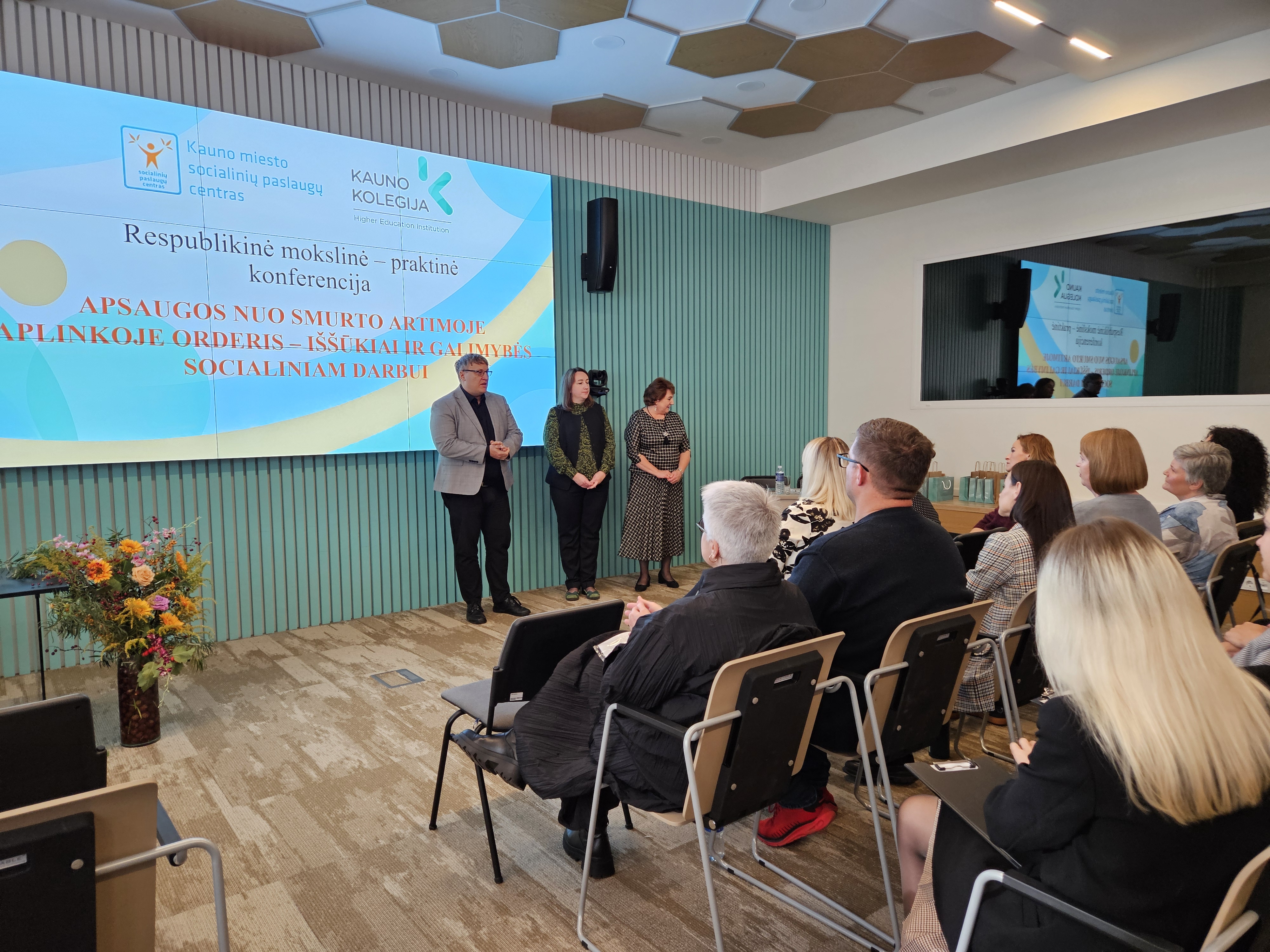 Šiandien įvyko Kauno kolegijos Menų ir ugdymo fakulteto Socialinio darbo katedros ir Kauno miesto socialinių paslaugų centro organizuota respublikinė mokslinė–praktinė konferencija „Apsaugos nuo smurto artimoje aplinkoje orderis – iššūkiai ir galimybės socialiniam darbui“, subūrusi socialinio darbo specialistus, praktikų ir akademinės bendruomenės atstovus iš įvairių Lietuvos miestų. Konferenciją moderavo Kauno miesto socialinių paslaugų centro direktorė ir Lietuvos socialinio darbo tarybos pirmininkė dr. Roberta Motiečienė bei Kauno kolegijos Menų ir ugdymo fakulteto Socialinio darbo katedros vedėja Virginija Kondratavičienė.