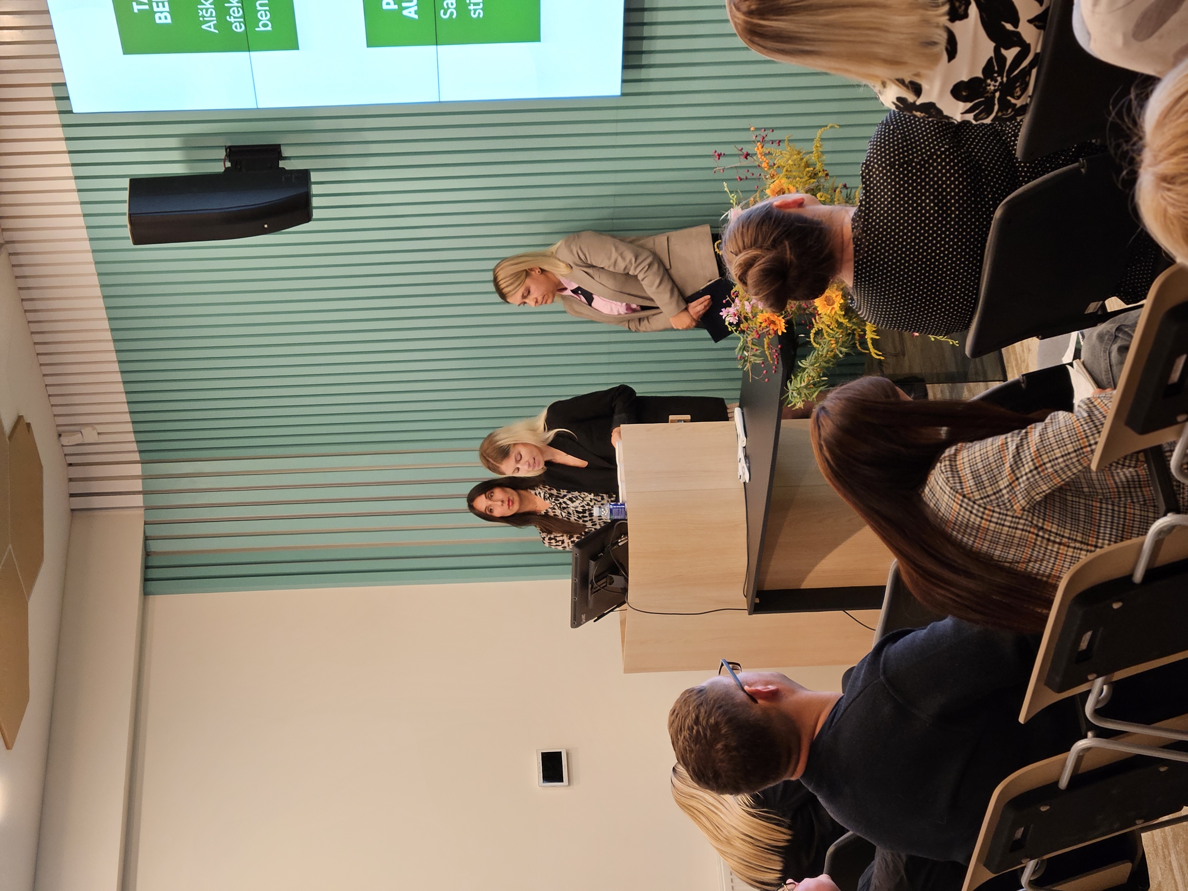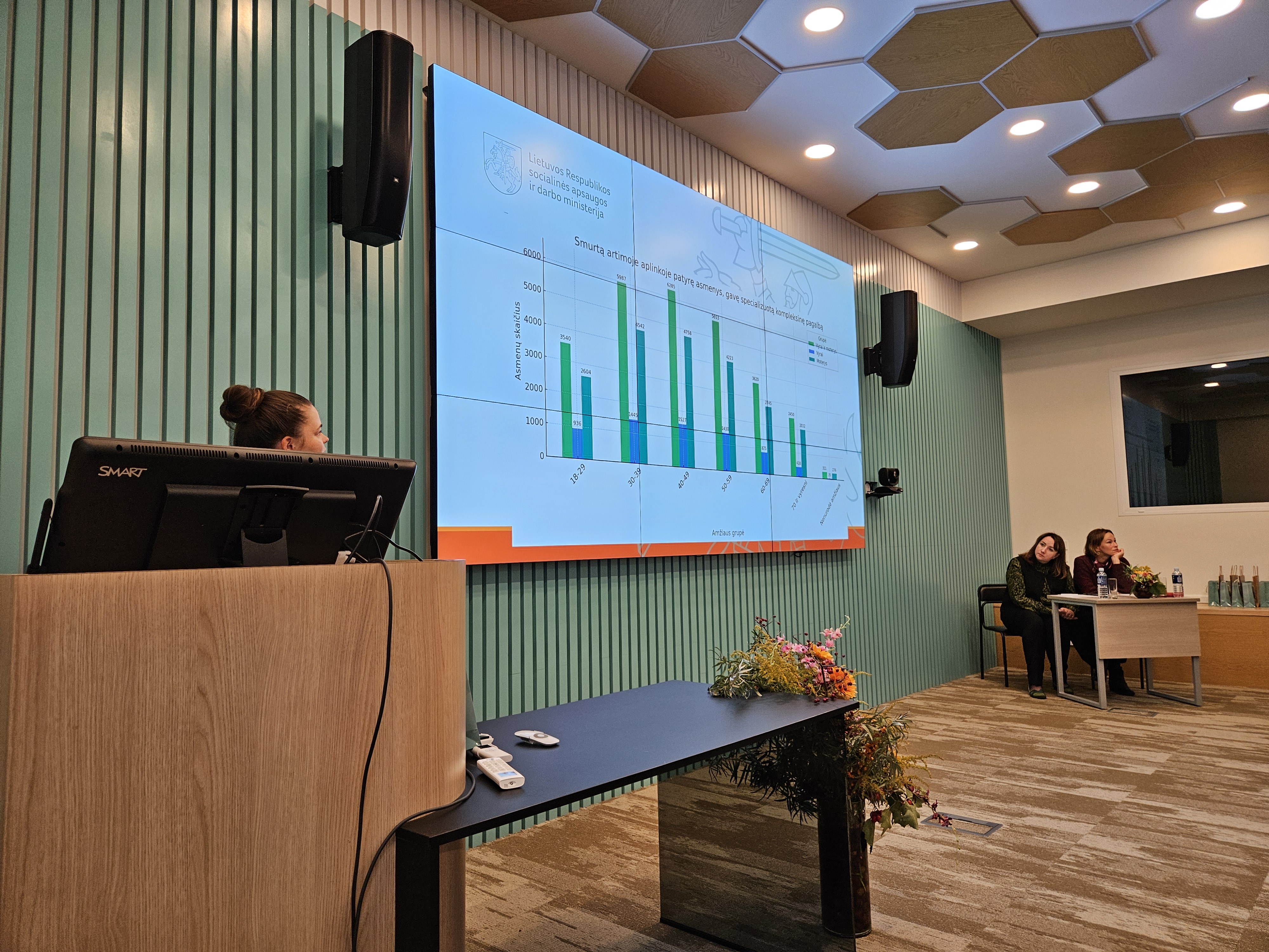 Konferencijos pabaigoje Virginija Kondratavičienė ir Indrė Juškevičienė pristatė tyrimą apie socialinių darbuotojų patiriamus sunkumus dirbant su asmenimis, kuriems taikomas apsaugos nuo smurto artimoje aplinkoje orderis.
