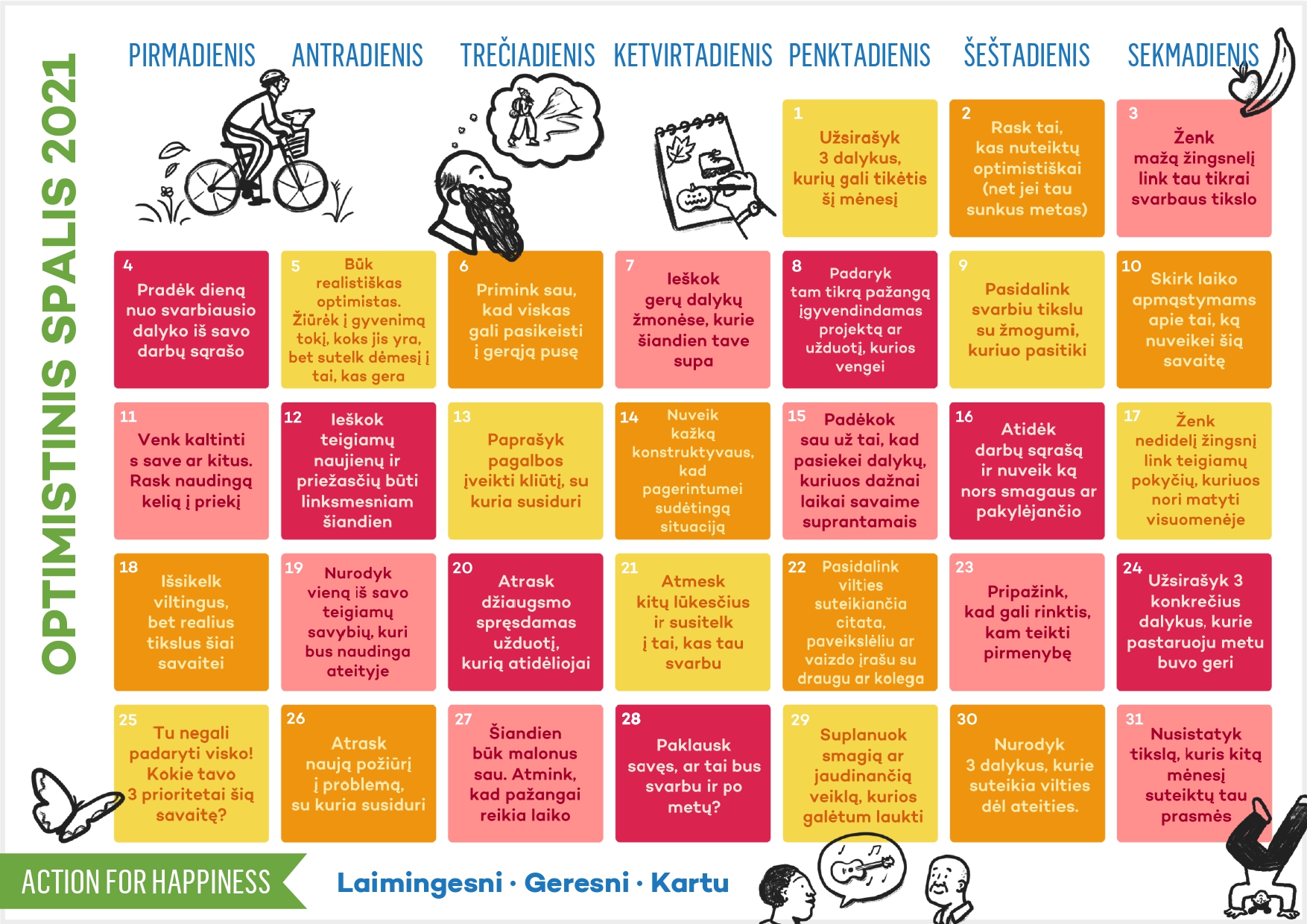 Kauno kolegijos Menų ir ugdymo fakulteto psichologijos dėstytoja Rasa Vaitkienė rekomenduoja spalio mėnesį labiau pasirūpinti savo psichine sveikata ir dalijasi Action for Happiness judėjimo iniciatorių sudarytu optimistišku mėnesio kalendoriumi.